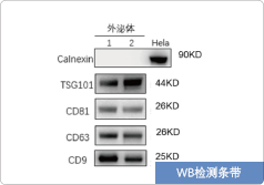 Western Blot Western blot是通過抗原抗體特異性結(jié)合的原理,對外泌體標(biāo)記蛋白進(jìn)行檢測,從蛋白質(zhì)組學(xué)方面對外泌體進(jìn)行鑒定,常見外泌體蛋白指標(biāo)有CD9、CD63、CD81、Tsg101、Calnexin、Alix等。